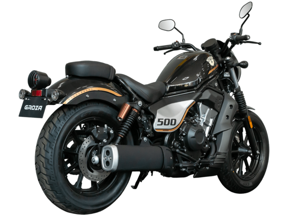 GROZA XS500 – великолепный лёгкий круизёр, идеальный как для езды по мегаполису, так и для поездок по загородным дорогам.Рядный двухцилиндровый четырёхтактный мотор объёмом 471 см3 выдаёт внушительные 48 л.с. и при высоких показателях динамики и отличном крутящем моменте способен разгонять аппарат до 160 км/ч. Инжекторный впрыск топлива с инжектором DELPHI увеличивает топливную экономичность, а также позволяет добиться высокой приёмистости и неприхотливости агрегата. Привод на ведущее колесо осуществляется с помощью цепи. Жидкостная система охлаждения не допустит перегрева мотора даже при самом агрессивном вождении.На аппарат установлена 6-ступенчатая механическая коробка передач с классической схемой “1-N-2-3-4-5-6”. Мотоцикл оснащён литыми алюминиевыми дисками диаметром 16 дюймов. С неровностями дороги эффективно справляются телескопическая вилка спереди и два газонаполненных амортизатора сзади. Задние амортизаторы являются регулируемыми, что обеспечивает лёгкую перестройку на различные режимы езды. Эффективное и безопасное замедление с любых скоростей обеспечивают гидравлические дисковые тормоза с ABS спереди и сзади.Мотоцикл имеет множество привлекательных декоративных элементов в олдскул-стилистике, что делает его похожим на кастом-байк.XS500 сочетает в себе отличные технические характеристики, комфорт и надёжность, что позволяет вам ощутить настоящую свободу на любой дороге.