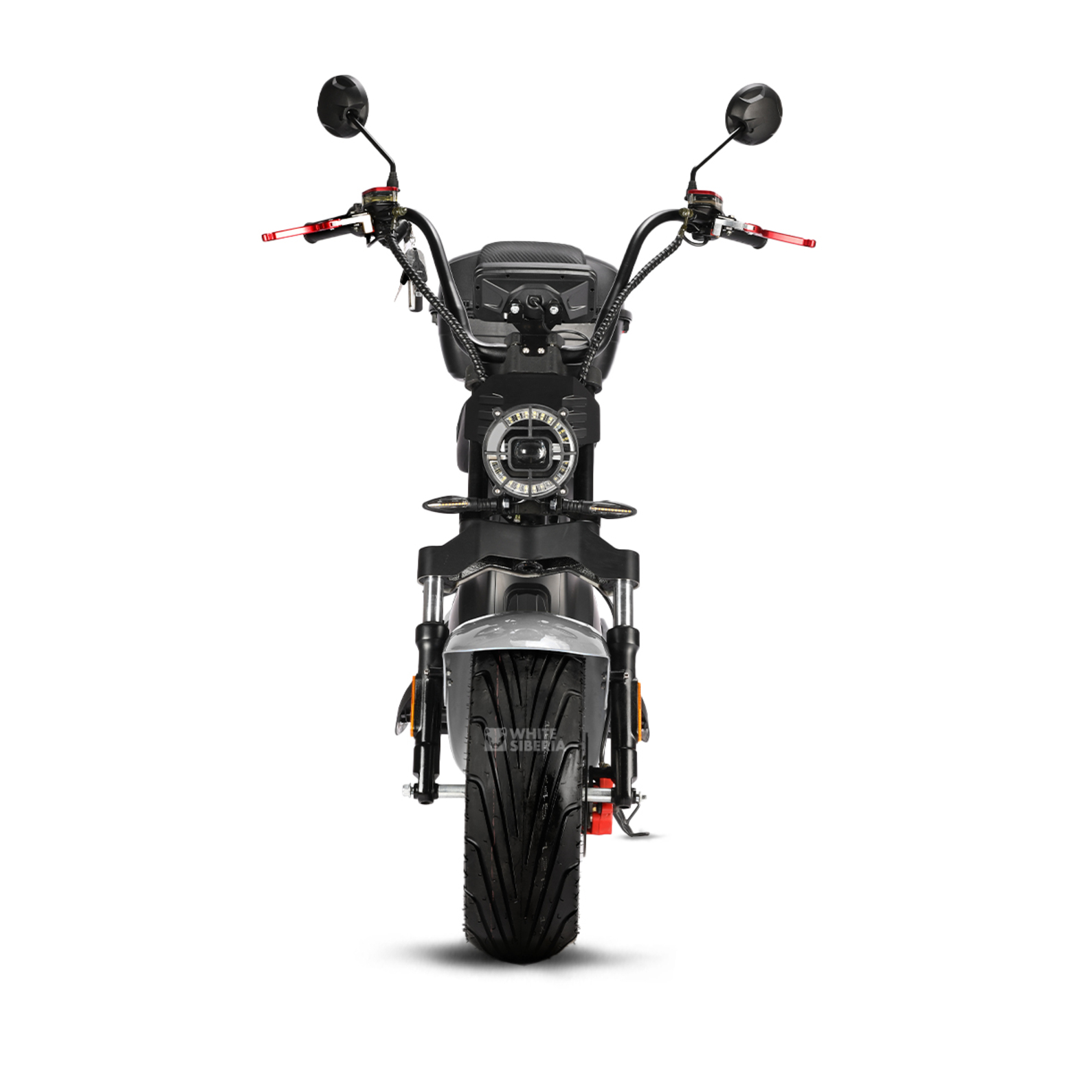 Электроскутер White Siberia Black Sea 5000W – эксклюзивная новинка от White Siberia. Компанией представлен совершенно новый взгляд на форм-фактор CityCoco и его дизайн. Брутальный и харизматичный скутер смотрится ярко и броско: каждая его деталь оригинальна. Модель полностью адаптирована к российским условиям и дорогам.Конструктивно электроскутер White Siberia Black Sea 5000W не имеет аналогов среди похожих моделей. У него оригинальная рама и большое мотоциклетное седло. Сиденье очень комфортное и рассчитано на перевозку водителя и пассажира. Позади седла – площадка для крепления бокса или кофра. В базовой комплектации скутер поставляется с кофром, который подходит для транспортировки личных вещей и одновременно служит спинкой для пассажира.Электроскутер плавно движется по городскому асфальту и легкому бездорожью за счет качественных амортизаторов спереди сзади. Двойная настраиваемая подвеска мотоциклетного типа эффективно сглаживает дорожные неровности. Широкие покрышки с оригинальными колесными дисками не только придают скутеру эффектный вид, но и обеспечивают устойчивость во время движения. White Siberia Black Sea 5000W имеет высокий руль чоппер, на который введен все необходимые элементы управления. Транспорт укомплектован большим информативным бортовым компьютером, полным комплектом светодиодной оптики, зеркалами заднего вида, надежными дисковыми гидравлическими тормозами, стояночной подножкой.