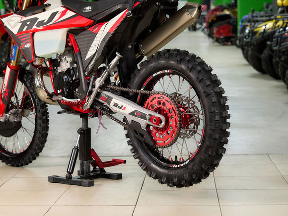 Подробнее о AX300Модифицированная подвеска разработанная AJ1 совместно с HTW, регулировать которую можно теперь без применения инструментов, «на ходу». Двухкамерная передняя вилка с закрытым картриджем (DCC) серии AJ1-T10 с диаметром пера 48 мм и длиной 940 мм, в которой используются двукомпонентные сальники SKF Италия, а также высококачественные направляющие от японской фирмы DID ЯпонияМоноамортизатором HTW T10 регулировка без инструмента с системой PDSНовые фрезерованные траверсы со всеми регулировками а также руль переменного сечением из высокопрочного алюминиевого сплава марки 7075-T6.Новая запатентованная конструкция воздушного фильтра AJ1-Pro Red. Предварительно пропитанный смазкой - фильтр специально создан для обеспечения максимального потока воздуха, сделанный из негорючего материала.Новые радиаторы и дефлекторы воздуха позволили повысить набегающий поток и улучшить охлаждение при движении.Широкие фрезерованные подножки AJ1 из алюминиевого сплава, со сменными шипами из нержавеющей стали.Обода из алюминия 7050-T6 в стандартной комплектации имеют подшипники NSK, 4-мм спицы из нержавеющей стали и алюминиевыми ниппелями в сочетании с новыми шинами AJ1 soft compound обеспечивает постоянное сцепления колес в разных дорожных условиях.Размер колес: перед – 80/100-21 зад – 120/100-18Новый алюминиевый маятник без прогрессии + направлющими с низким коэффициентом трения обеспечивает лучший контроль и экономию веса, необходимую на треке и в горах.Запатентованная тормозная система AJ1 зарекомендовавшая себя, как лучшая в классе, великолепно работающая с тормозными дисками нового дизайн и синтетическими спеченными тормозными колодками Elig Тайвань. Спереди установлен двухпоршневой суппорт AJ1 в сочетании с диском диаметром 260 мм. Сзади – однопоршневой суппорт с диском диметром 220 ммВ стандартную комплектацию входит новая алюминиевая складывающаяся боковая подставку нового дизайна, а также фирменное сиденье AJ1Anti Skid, выполненным из нескользящего материала со специальными прорезиненными вставками.Ведомая звезда AJ1 520 на 52 зубаВыхлопная титановая система AJ1 с Power Bomb и DB-Killer (съёмный) легче на 1 кг предыдущих выхлопных систем от AJ1