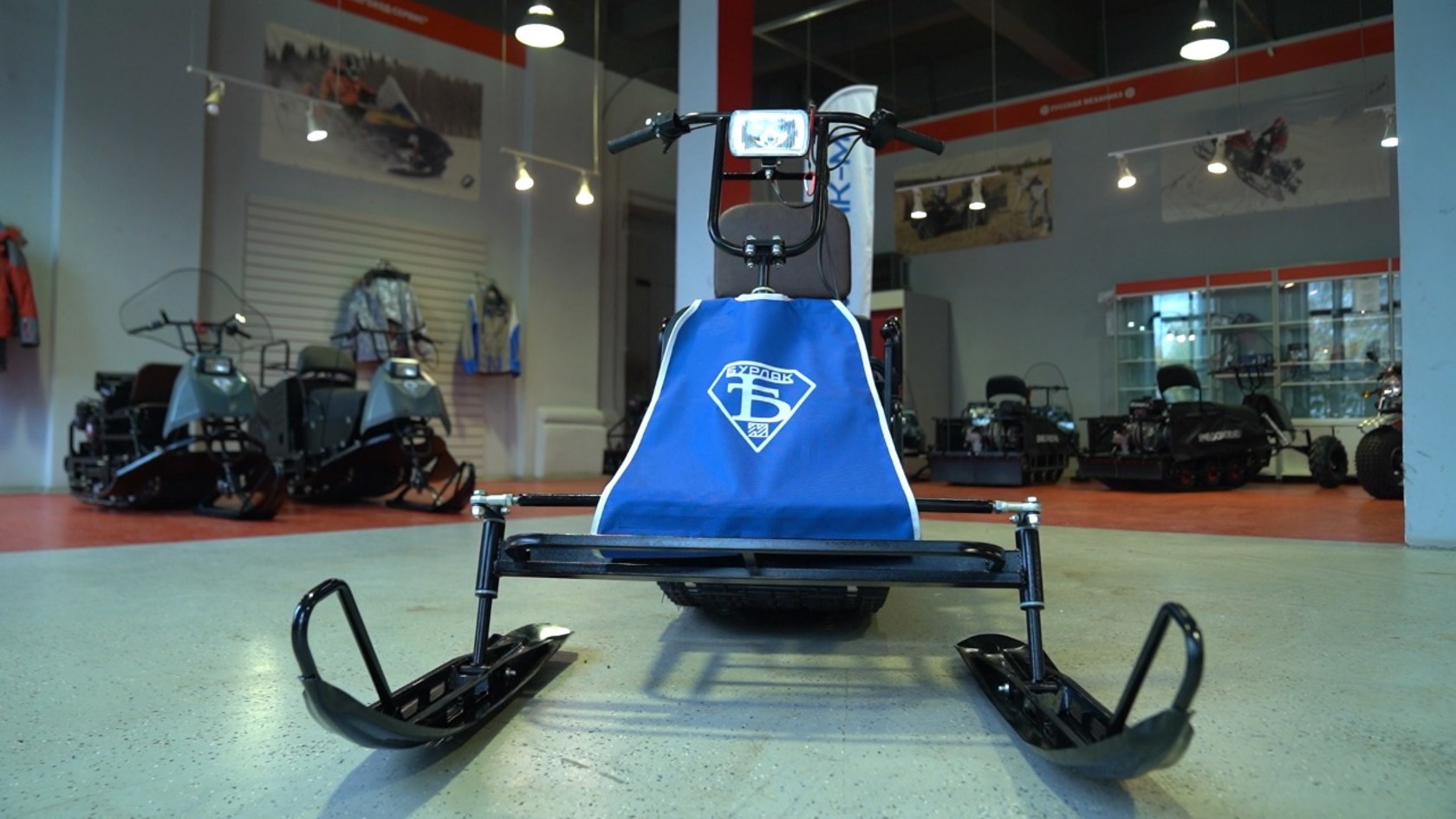 Установленный в базовой комплектации лыжный модуль с сиденьем превращает Бурлак-М Опти-R в доступный аналог миниснегохода.Модель собрана на классической базе длиной 1450 и шириной 510 мм, имеет катковую подвеску, комплектуется двигателем 15 л.с и трансмиссией вариаторного типа.На лыжном модуле установлены две лыжи от снегохода «Тайга». Галогеновая фара входит в базовую комплектацию.Дополнительно можно установить тормоз, реверс и съемный кофр.