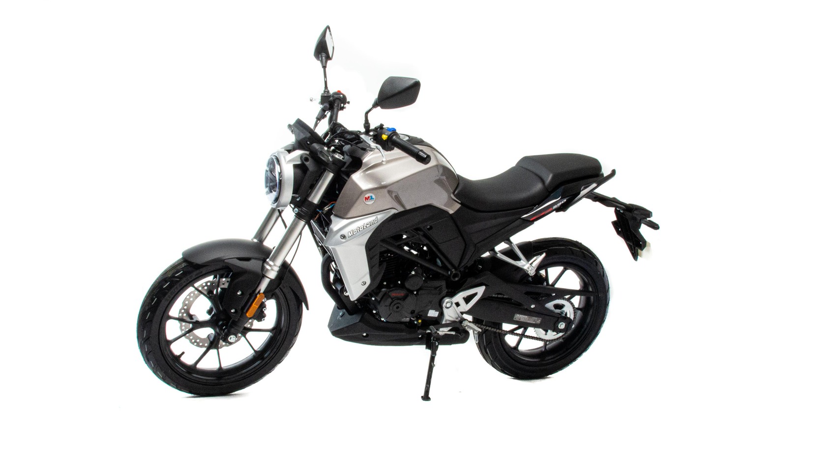 Мотоцикл Motoland CB250 (172FMM-5/PR250) (2022 г.) - новинка 2022 года. Дорожный мотоцикл (стритбайк) MotoLand CB250.CB250 является стильным, ярким и в то же время доступным мотоциклом. Современный облик подчеркивается последними решениями от лидеров мирового мотостроения: светодиодная оптика, дизайн пластика, харатеристики подвески, глушитель, расположенный под рамой.Данную модель выделяет покладистый характер, выверенная посадка, отточенная управляемость в городе и на трассе. Комфортное седло подходит для райдеров среднего роста.СВ250 оснащен двигателем 172 FMM (172FMM-5/PR250) с балансирным валом и 5-ступенчатой коробкой передач, мощностью 21 лс, с воздушно-масляным охлаждением, кикстартером / электростартером. На двигателе установлен карбюратор Keihin PZ 30.Также на новинке установлены усиленные двухпоршневые передние тормоза, литые алюминиевые обода, передняя вилка перевёрнутого типа с большим ходом, которая обеспечивает отличную управляемось для комфортного передвижения, как по городу, так и по бездорожью.Усиленная 520 цепь в сочетании с хорошо подобранными звездами, обеспечивает отличную динамику.Качественные покрышки на 17" ободах, 110/70 и 140/70, обеспечивают отличное сцепление с дорожным покрытием. Рама дуплексная, профилированная, усиленная ребрами жесткости. Удобное мягкое сиденье и жидкокристаллическая цветная панель приборов с подсветкой - порадуют комфортом и удобством.