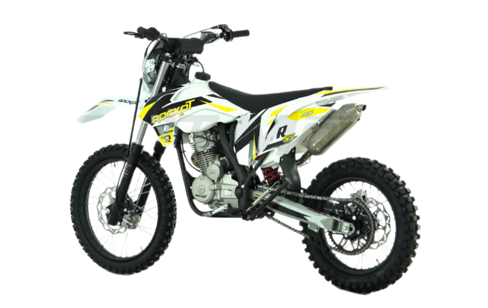 1ROCKOT R5S - эндуро мотоцикл начального уровня, который создан для новичков и подростков. Небольшая высота по седлу и короткая колесная база обеспечивают отличную управляемость и позволяют управлять мотоциклом людям, чей рост достигает 150 см. ROCKOT R5S построен на базе уже известных многим мотоциклов ROCKOT R5 Cyclone и R5F Raptor. ДизайнМотоциклы ROCKOT серии R имеют общую раму, пластик и концепцию дизайна. Различна между ними цветовая схема графики облицовочного пластика.Рама мотоцикла R5S окрашена в черный цвет. На белом облицовочном пластике нанесена прочная защитная пленка с графикой в белом черном и желтом цветах. Сам пластик выполнен в стиле КТМ 2015. Передние амортизаторы и обода колесных дисков, как и рама, окрашены в черный матовый цвет. ДвигательЭндуро мотоцикл ROCKOT R5S оснащен четырехтактным двигателем, объемом 144,6 см³ и мощностью 11,6 лошадиных сил. Система ГРМ 2-х клапанная с верхним распредвалом. Запуск двигателя может осуществляться как электростартером, так и кик-стартером. Коробка передач - пятиступенчатая с многодисковым сцеплением в масляной ванне. Двигатель очень отзывчиво откликается на ручку газа, но в то же время прощает ошибки, поэтому данная модель и будет идеальной для новичка. РамаROCKOT R5S построен на раме типа К5, ставшей очень известной благодаря мотоциклам ROCKOT R5 Cyclone и R5F Raptor. При том, что это мотоцикл с высотой по седлу равной питбайку, он имеет настоящую полноценную мотоциклетную раму из хром-молибденовой стали. Геометрия рамы идеально сбалансирована для эндуро и обеспечивает отличную управляемость на бездорожье. Подрамник также выполнен из стали. ПодвескаДанная модель построена на классической эндуро подвеске. Спереди установлена телескопическая вилка с толщиной перьев 37 мм, что является внушительным диаметром для классической вилки. Сзади установлен стальной маятник с моноамортизатором. Конструкция задней подвески - безлинковая, что упрощает обслуживание мотоцикла. Тормозная системаПолностью вся тормозная система мотоцикла - дисковая гидравлическая. Спереди и сзади установлены тормозные диски равного диаметра - 240 мм. Сзади установлен однопоршневой тормозной суппорт, спереди - двухпоршневой. КолесаВажная отличительная часть мотоцикла - колеса размерностью 19/16. Данное решение позволило сделать среднеразмерный эндуро мотоцикл идентичным по геометрии и управляемости полноразмерному эндуро, а также уменьшить высоту по седлу. Спереди установлена шина размерностью 80/100-19, сзади - 110/90-16 с внедорожным грязевым протектором.. Также, в отличие от других мотоциклов подобной компоновки, он приводится в движение цепью с 520 шагом, тогда как у других мотоциклов установлена цепь с шагом 428. Стальная приводная ведомая звезда на 47 зубьев обеспечивает высокий крутящий момент и позволяет заезжать на высокие подъемы с крутым уклоном. Кому подойдет эндуро мотоцикл ROCKOT R5SROCKOT R5S можно назвать промежуточной моделью между питбайком и полноценным мотоциклом. Колесная база мотоцикла - 1340 мм, а высота по седлу - 850 мм. Если вы задумываетесь, что вам подойдет больше, питбайк или мотоцикл - ROCKOT R5S для вас. Данная модель поможет райдеру понять принцип управления мотоциклом, научиться пользоваться мотоциклетной пятиступенчатой коробкой передач и почувствовать отличную управляемость, которая присуща только мотоциклам. Данную модель высоко оценя