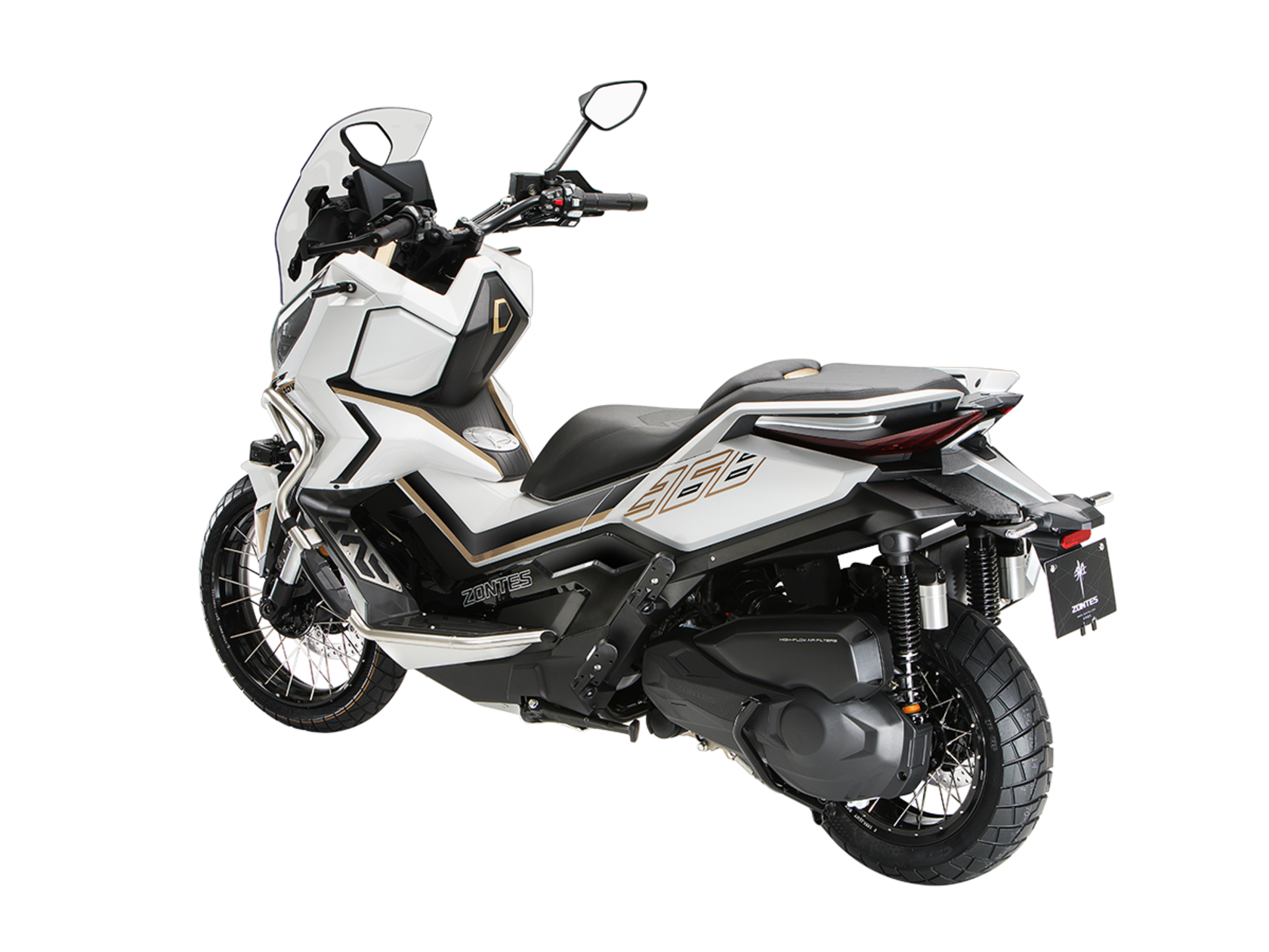 Скутер ZONTES ZT368-G – максискутер двойного назначения, готовый пронестись по улицам города за его пределы и отправиться по грунтовым тропам прокладывать свой маршрут туда, куда вам потребуется. Регулируемая подвеска с перевёрнутой телескопической вилкой спереди обеспечит отличную управляемость и устойчивость в любых условиях.Силовая установка представлена одноцилиндровым 4-тактным двигателем. Двигатель имеет объём 368 см³ и обеспечивает мощность в 38,8 л.с. Оснащён инжектором BOSCH, системой жидкостного охлаждения и вариатором. Запуск двигателя осуществляется с помощью бесключевого доступа.Ёмкость топливного бака 17,5 литра.Колёса имеют диаметр 17 дюймов спереди и 14 дюймов сзади. Для подвески спереди используется телескопическая вилка перевёрнутого типа, а сзади установлены 2 гидравлических амортизатора. Гидравлические дисковые тормоза произведены компанией J.JUAN, входящей в холдинг BREMBO. Мотоцикл также оснащён 2-канальной ABS-системой, противобуксовочной системой TCS System и датчиками давления в шинах.ZT350-G оборудован яркой LED-фарой, мультимедийной приборной панелью с TFT-дисплеем, имеются 2 USB-порта.Габариты скутера 2230х925х1290 мм. Колёсная база 1560 мм. Высота по седлу 795 мм. Вес 198 кг.